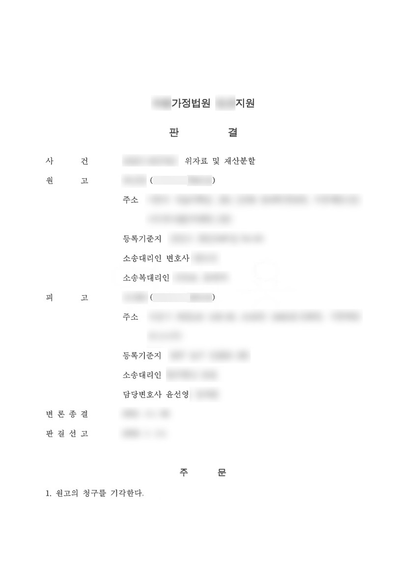 아내의 청구는 기각되었고(아내는 재산분할대상 중 본인 명의의 부동산을 소유하고 있어 남편이 아내에게 재산분할로 추가 지급할 금액이 없다는 결과), 소송비용은 아내가 전부 부담하도록 하여 성공적으로 방어하였습니다.