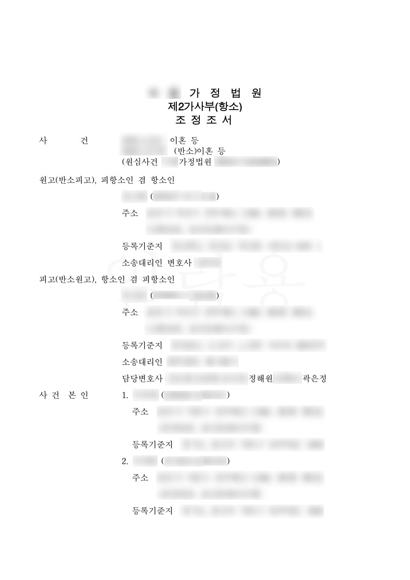 결국 남편이 첫째 딸, 아내가 둘째 딸에 대한 친권 및 양육권을 각 가져올 수 있었으며, 아내의 부동산 처분금지가처분 취하 및 집행해제를 통해 재산분할금을 조달하는 등 원만하게 조정이 성립될 수 있었습니다.